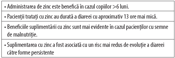 Recent, OMS a emis recomandări noi privind administrarea de zinc ca tratament adjuvant în diareea apoasă și diareea persistentă la copii. Astfel, s-a extins utilizarea acestui tratament și la copiii mai mari de 10 ani. De asemenea, doza de zinc a fost redusă la 5 mg/zi pentru a diminua incidența vărsăturilor ca efect advers. Durata tratamentului rămâne între 10 și 14 zile, conform recomandărilor anterioare, iar forma preferată de zinc este cea sub formă de gluconat.