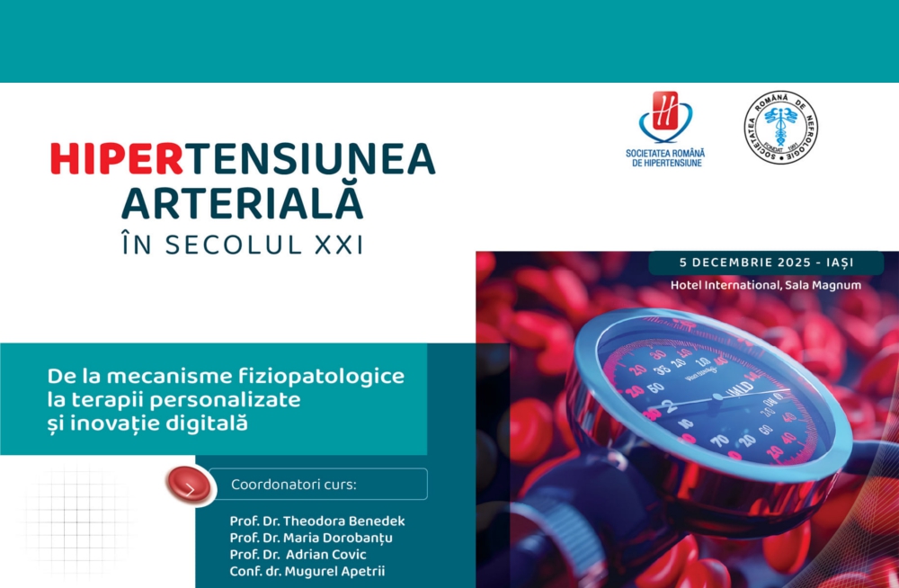 Cursul „Hipertensiunea arterială în secolul XXI – De la mecanisme fiziopatologice la terapii personalizate și inovație digitală”, organizat sub egida Societății Române de Hipertensiune și a Societății Române de Nefrologie, va avea loc pe 5 decembrie la Iași, Hotel International, Sala Magnum.