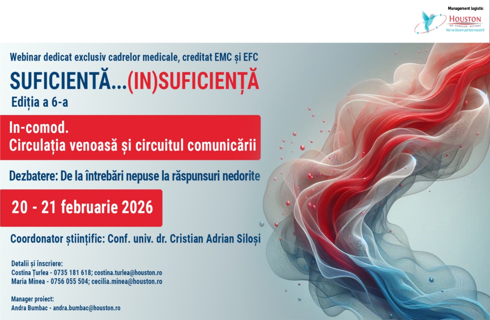 Ediția a 6-a a webinarului „Suficientă…(in)suficiență!”, coordonată științific de Conf. univ. dr. Cristian Adrian Siloși, propune o privire onestă și actuală asupra insuficienței venoase și bolii venoase cronice, dincolo de protocoale și ghiduri, aducând în prim-plan: